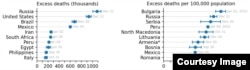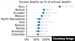 В графике, показывающем пропорциональное отношение избыточной смертности к обычному уровню смертности, Россия – на восьмом месте после нескольких латиноамериканских и балканских стран.