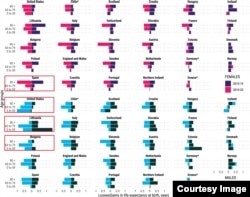 Единственные две страны в исследовании, где ожидаемая продолжительность жизни увеличилась, – Дания и Норвегия (за счет уменьшения числа умерших от гриппа и т. п.). Заодно можно увидеть, насколько хуже проходит пандемию соседняя с ними Швеция – в этой стране падение ожидаемой продолжительности жизни составило более полугода.